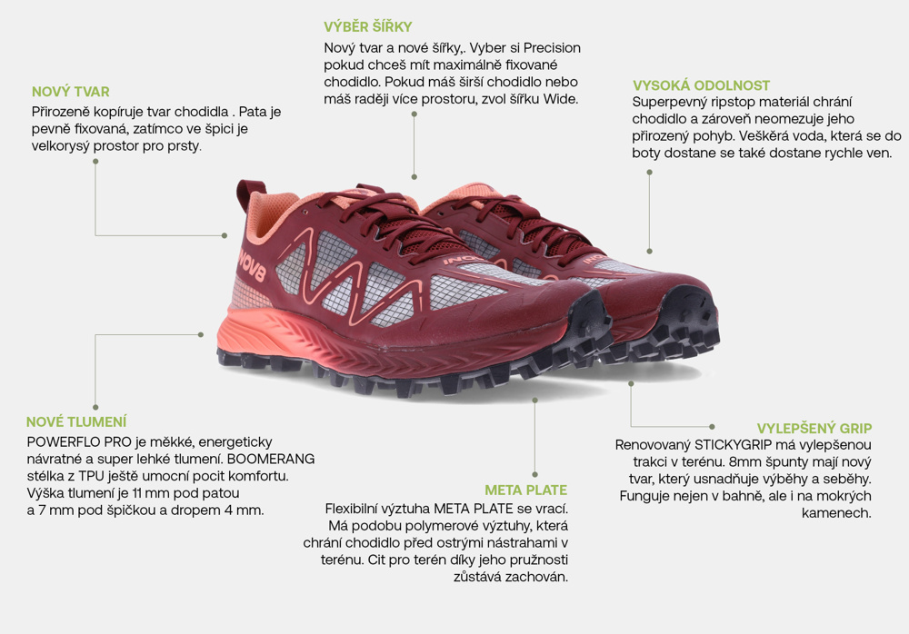 Kromě toho, že se MUDTALON může pochlubit novým tvarem svršku, je k dispozici také ve dvou šířkách. Šířka Precision (úzká) pevně zafixuje chodidlo v náročném terénu. Šířka Wide (široká) poskytne extra pohodlí na delší vzdálenosti.