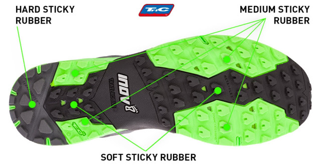 Podešev je opět složena ze tří různě tvrdých nebo přesněji řečeno hustých směsí kontaktní pryže (TRiC), aby nabídla dobrý grip na různém přírodním podkladu. Patní část má nejvyšší tvrdost a nabídne dobrou otěruvzdornost. Obvodové části podešve nabízí středně tvrdou směs pro jistý došlap a účinné vedení odrazu a střední část je vyrobena naopak z měkčí směsi pro efektivní kontakt na tření při běhu na skále nebo v kamenitém prostředí.