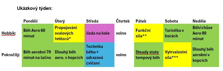 Sestavení tréninkového plánu je velmi individuální záležitostí – závisí na aktuální kondici, časových možnostech a osobních cílech běžce. Následující ukázkové týdny proto slouží pouze jako orientační inspirace. Každý tréninkový blok klade důraz na něco jiného – ať už na objem, tempo nebo specifickou závodní přípravu. Nekopírujte slepě tréninky jiných, mohou mít zcela odlišnou výchozí situaci.