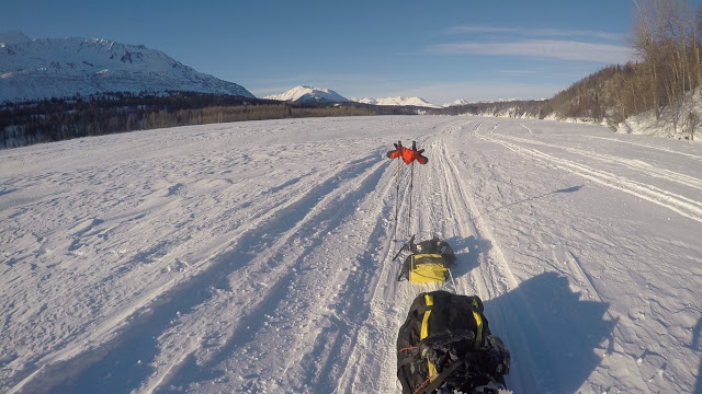 První den proběhl relativně v pohodě. Za to noc byla překvapivá. Šlapal jsem zhruba do 4 ráno a pak solidní krize a únava mě donutili zabivakovat. Předpověď hlásila -15°C, ale realita byla jiná. Šli jsme po řece a bylo -40°C. Bivakovat na řece nebylo ideální a taky jsem se moc nezahřál. Nejhorší je do takový kosy vstávat. Přes den je naštěstí sluníčko a relativně teplo, někdy až dokonce moc teplo. To znamená kolem -5°C a víc, což zase znamená měkčí sníh, těžší saně a náročnější pohyb. Chodidla mam opuchlý a v těchto teplotách se přehřívají. Noha se potí, ale pot mrzne na botě a dokonce postupem času i v botě. Tím se prostor v botě zmenšuje a to je čas vyměnit si boty. Druhý den dorazim na první checkpoint Yentna station. Dvě hodiny si odpočinu a šlapu dál. Uvědomuji si, že mám zrovna narozeniny a tak si dopřávám lahodné craftovice nad rámec denního limitu. Povinnosti během celého dne a noci se zužují na pohyb, jídlo a trochu spánku. Spánku jen opravdu trochu a to postupem času začíná být problém. Přes noc je kolem -30°C a tak se už lépe funguje. Krize se dostavují v častějších intervalech a občas je těžké s nimi bojovat. První tři dny je to převážně po řece, čili rovina. V angličtině pro to existuje trefný výraz “mind fuck” . Již druhý den vidím na horizontu hory, které budeme přecházet, a vůbec se nepřibližují. Třetí den jsme konečně blíže horám a už se nemůžu dočkat až se do nich pustím. Výhledy, pestrost, majestátnost hor a hlavně změna monotónního pohybu. Čtvrtý den ve 4 ráno začnu stoupat do Rainy pass, nejvyššího bodu závodu. Aljaška mě odmění nádhernou polární záři, pak potrestá větrem a při východu slunce opět odmění nádhernou scenérií. Cesta přes hory byl největší zážitek závodu. Pátý den není o zážitky nouze. Chůze po úplně hladkém ledu, často nakloněném v různých úhlech, za prudkého větru byla dost vyčerpávající. Vítr foukal z boku a neustále mi otáčel sáně, a s nimi i mě. Naštěstí jsem měl hřeby na botech, ale byly místa, kde ani hřeby nefungovaly. Pak přišel zvlněný úsek, kde se díky mikro klima, již neudržel žádný sníh a tahat několik hodin saně po kamenech, štěrku, písku a trávě je skvělá věc. Do toho vždy k ránu slyším vlčí smečky jak si na dálku povídají. Šestý den graduje spánková krize. Hlavně přes noc. Jdu půl hodiny a začnu usínat. Přicházejí mikro sny a často se nějakým snem vylekám, protože ztrácím pojem o tom co je reality a co je jen sen. Na Yukonu mi vždy pomohlo sednout na saně a 5 minut se v sedě prospat. Činím tak, ale po půl hodině znovu přichází spánek. Sedám na saně na 5 minut spánku. Šlapu půl hodiny a znovu. A znovu a znovu a znovu. Celou noc se spánku nemůžu zbavit. Nějak to přežiju a na posledním check pointu v Nikolai se pár hodin vyspím. Posledních 80km je dlouhých jak týden, ale vidina cíle je jak magnet. Krize přicházejí silné, ale ten cíl je cítit. Nakonec po sedmi dnech, jedné hodině a čtyřiceti pěti minutách dojdu do cíle do McGrath. Vůbec mi nevadí, že už nikam táhnout saně nemusím. Zážitků je spousty a jejich detailní podání si můžete přečíst na mých stránkách janfrancke.com. No a teď mi tady zbývá ještě trasa 1600km, ale na to potřebuji ještě trochu vyzrát, dejme tomu pár let.
