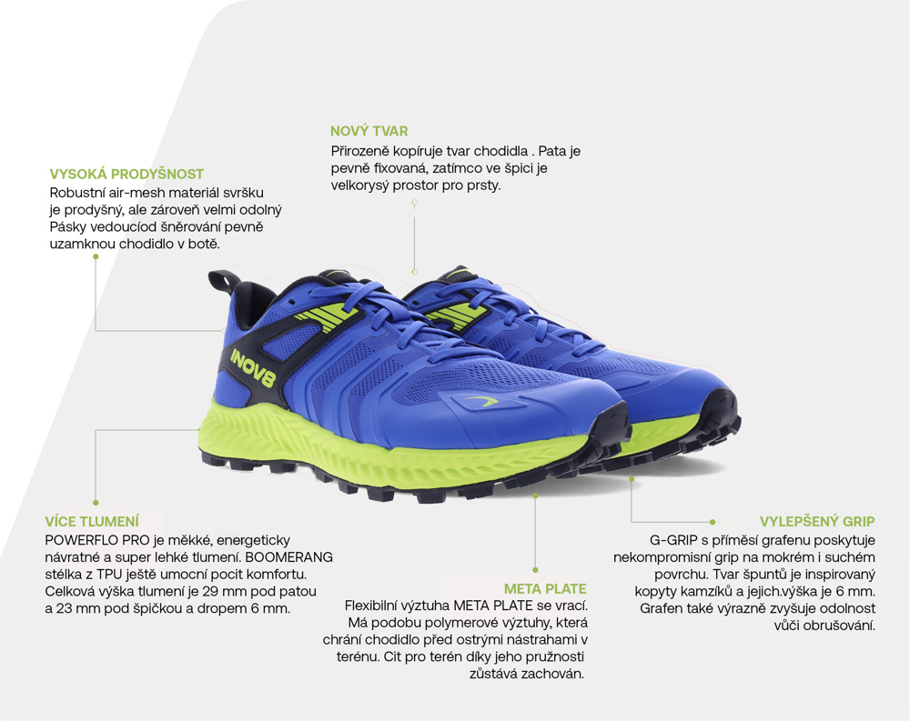 Tlumení POWERFLOW PRO zařazuje TRAILTALON do kategorie objemových bot, které tě budou provázet na trénincích i delších závodech. Díky energetické návratnosti tlumení a vnitřní stélky nebude tvůj běh ztrácet dynamiku.