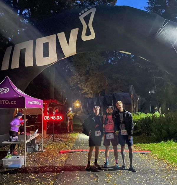 S oblečením to nakonec naštěstí bylo jednodušší. Věděl jsem, že v triku CRAFT Active Extreme s dlouhým rukávem dokážu přežít cokoliv mezi 5-20 stupni a stejně tak mi budou stačit kraťasy CRAFT PRO Trail 2v1. Největší jistotu volby jsem měl v ponožkách Inov-8 Speed Sock, které mi skvěle sedly už na několika ultra, a tak jsem si je schválně šetřil do Jeseníků. Obecně totiž platí, že můj levý palec rozedře absolutně všechno včetně kevlaru a s dírou na palci jsem to absolvovat nechtěl. Jenže rollercoaster… Ráno ještě na ubytku jsem si poctivě namazal prsty, chodidla, paty, ehm a stehna, po kraťasech jsem na levou nohu natáhl ponožku a hle – Pac-Man, takže záložní méně-děravé podkolenky. Poučení pro příště – pokud máš oblíbený pár ponožek, oblib si raději hned dva. Pak už jen tuna sladkého do vesty, voda a cola do flasků, stormshellka pro jistotu a hurá na start.